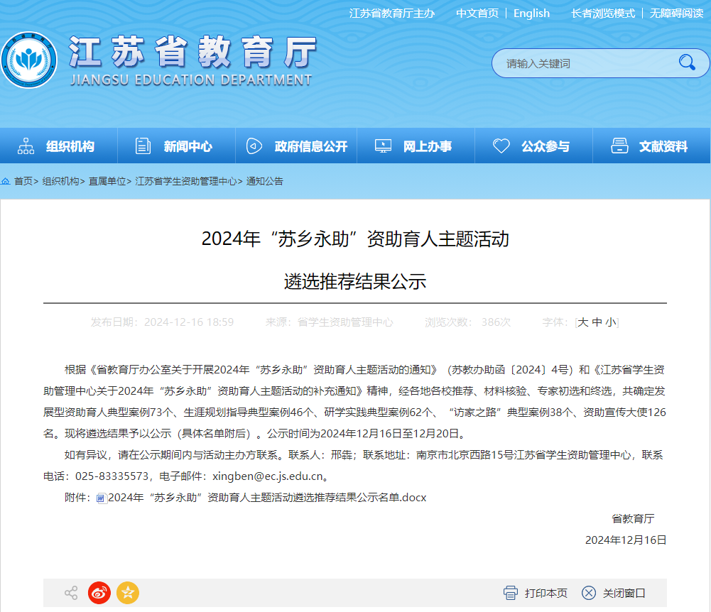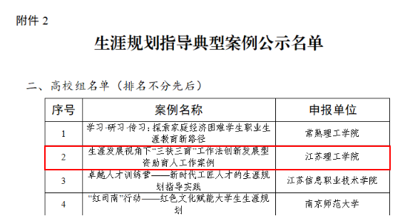 据悉,“苏乡永助”资助育人主题活动旨在推动建立全员参与、各部门配合、教育教学各环节协调联动的发展型资助机制,各地各校组织实施并报送活动成果。经专家初选和终评,最终确定“发展型资助育人典型案例”73个、“生涯规划指导典型案例”46个,“研学实践典型案例”62个、“访家之路典型案例”38个以及“江苏学生资助宣传大使”126名。(图文/学工处 李金东、周阳;审核/许晓星;编辑/张姚)