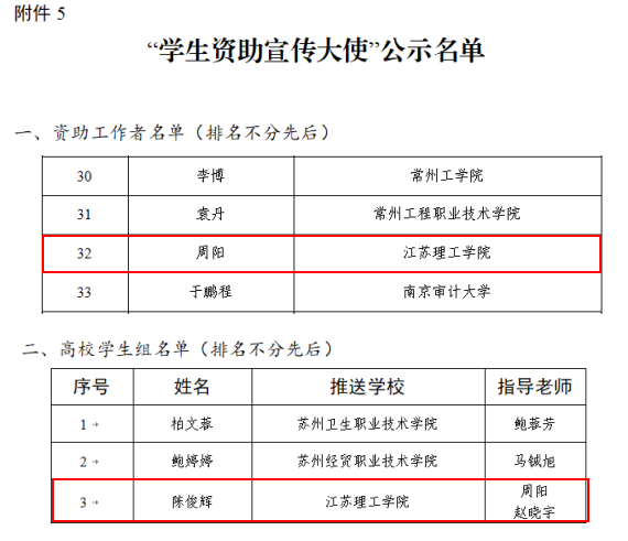 日前,由江苏省教育厅主办的2024年“苏乡永助”资助育人主题活动评选结果公示,我校汽车与交通工程学院、材料工程学院分别获评生涯规划指导典型案例、研学实践典型案例,学生工作处周阳、机械工程学院21机制1陈俊辉分别荣获“江苏学生资助宣传大使”荣誉称号。