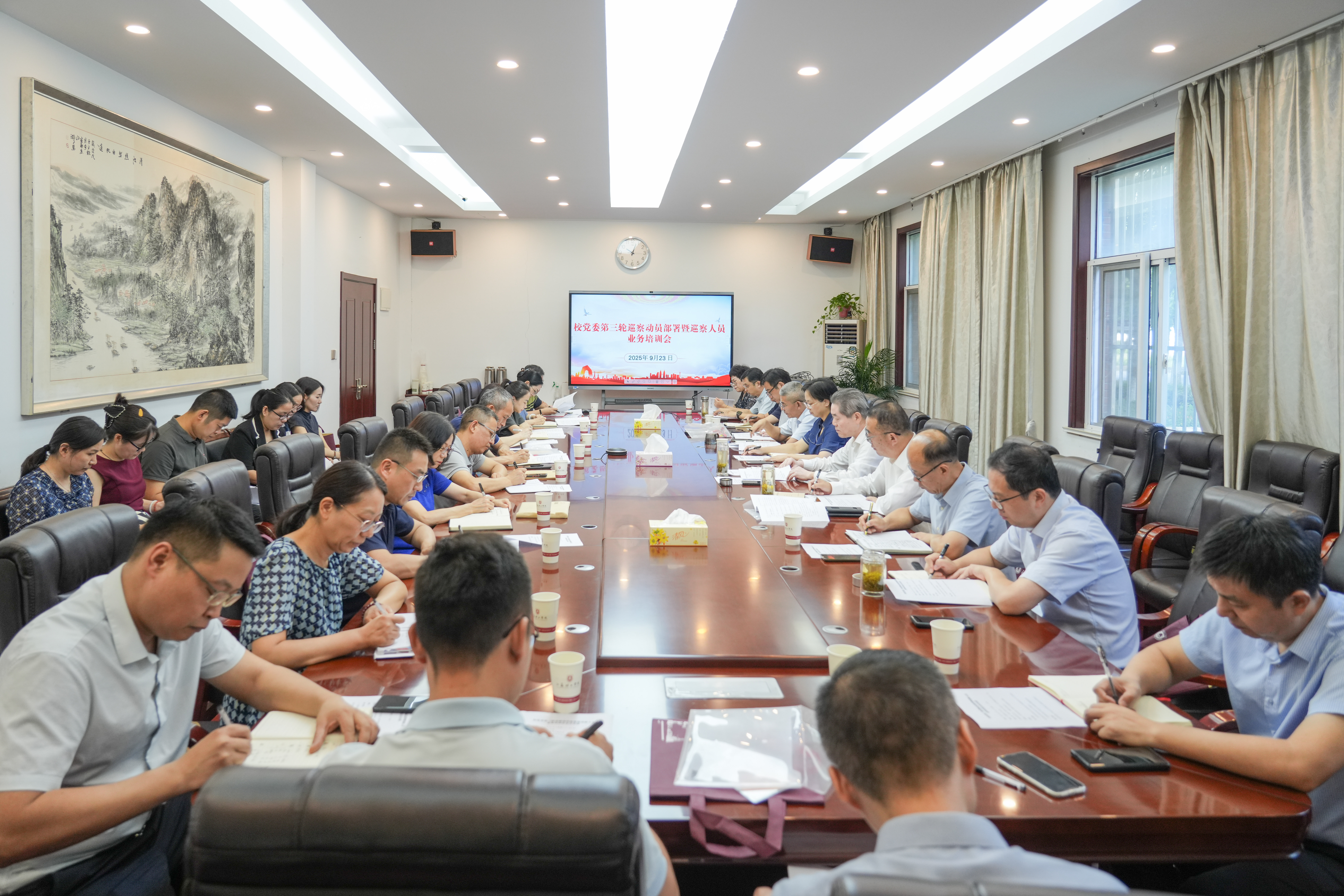 9月23日,校三届党委第三轮巡察动员部署暨巡察人员业务培训会在正德楼第二会议室召开。校党委巡察工作领导小组成员、相关部门负责人、巡察组全体成员、被巡察党组织负责人、巡察办全体人员参加会议。会议由校党委巡察工作领导小组副组长贝绍轶主持。