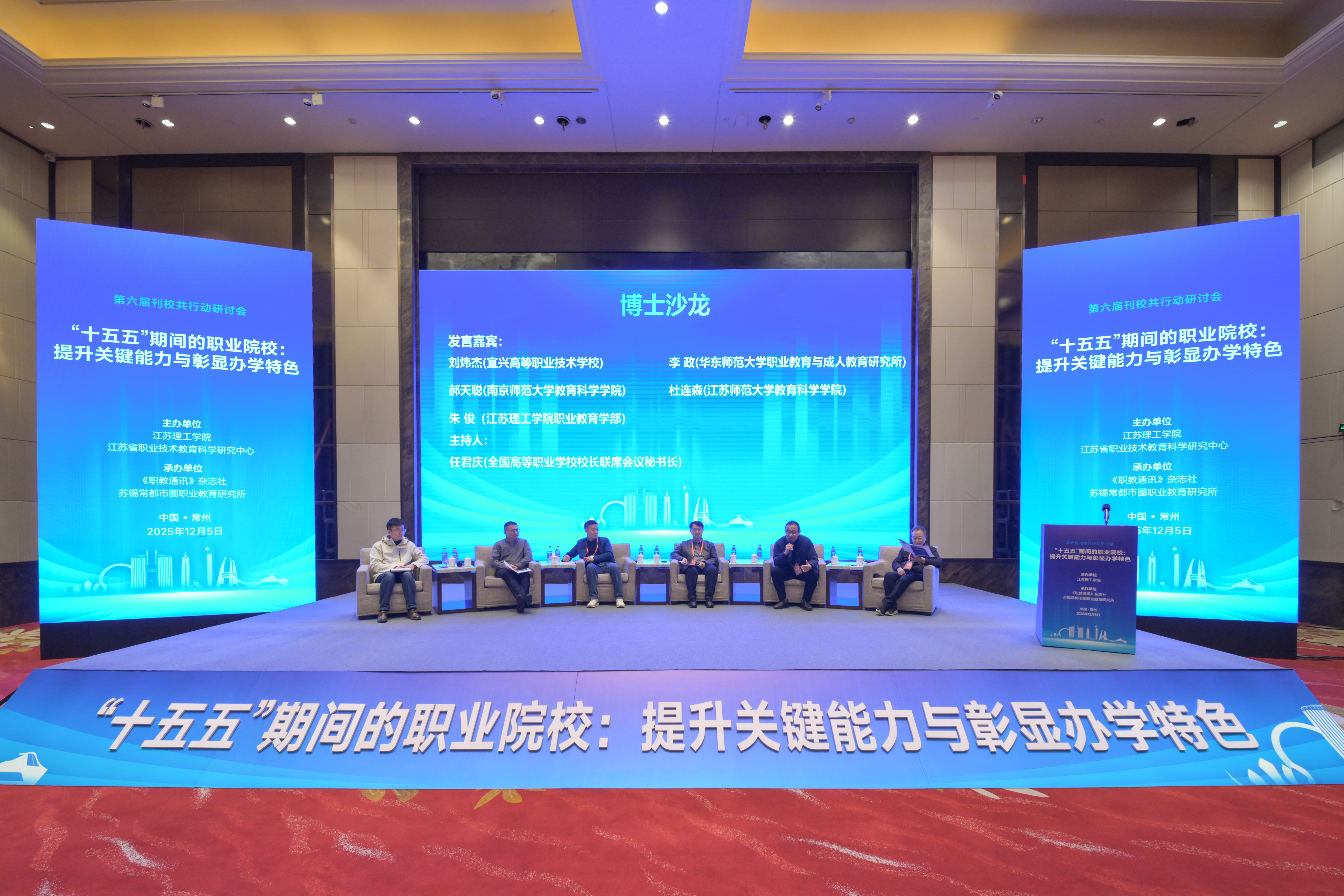 本次研讨会由江苏理工学院、江苏省职业技术教育科学研究中心主办,《职教通讯》杂志社、苏锡常都市圈职业教育研究所承办,会议主题为“‘十五五’期间的职业院校:提升关键能力与彰显办学特色”。在校长沙龙环节,盐城高等机电职业技术学校党委书记韩卫红、南京商业学校校长王克定、江苏省常熟中等专业学校校长徐丽娟、江苏省溧阳中等专业学校校长王光夏、无锡立信高等职业技术学校校长马建春围绕“提高职业院校办学能力(怎么理解办学能力,如何提高办学能力)”主题分别从实践层面作交流发言。在博士沙龙环节,宜兴高等职业技术学校党委书记刘炜杰博士、华东师范大学职业教育与成人教育研究所副教授李政博士、南京师范大学教育科学学院副教授郝天聪博士、江苏师范大学教育科学学院副教授杜连森博士、江苏理工学院职业教育学部朱俊博士围绕“建设特色鲜明的职业院校(如何理解特色鲜明,又怎么做到特色鲜明)”主题分别从理论层面作交流发言。校长沙龙环节、博士沙龙环节分别由徐伟、任君庆主持。(图/大学生通讯社 周晨熙、王宸瑶;文/职业教育学部 秦涛;审核/庄西真;编辑/周雅倩)