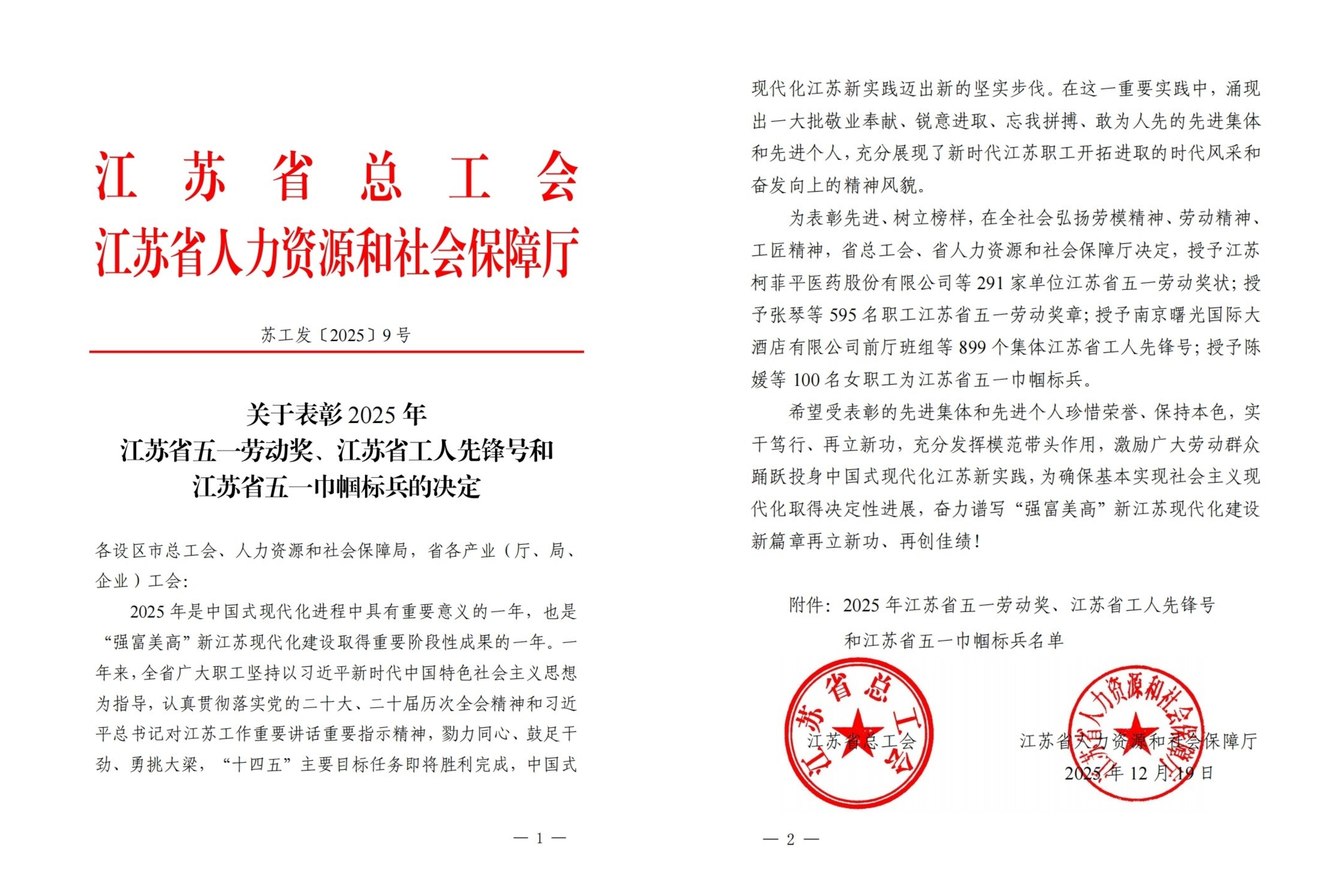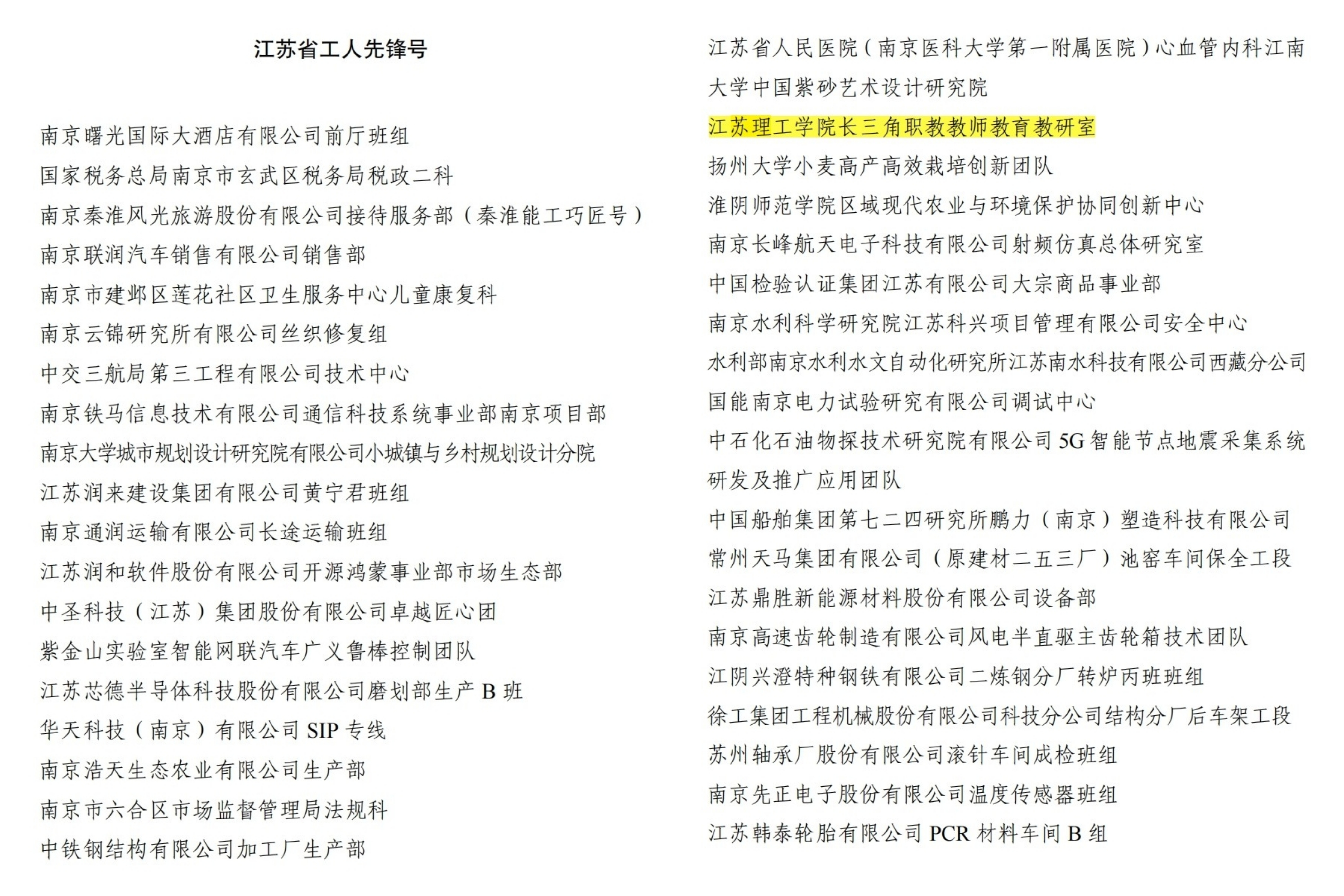 12月19日,江苏省总工会、江苏省人力资源和社会保障厅发布《关于表彰2025年江苏省五一劳动奖、江苏省工人先锋号和江苏省五一巾帼标兵的决定》(苏工发〔2025〕9 号)。我校长三角职教教师教育教研室荣获2025年“江苏省工人先锋号”称号。