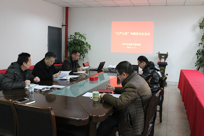 2016年1月6日下午,汽车与交通工程学院党政领导班子召开 “三严三实”专题民主生活会,会议由学院党委书记钱云福主持,崔景贵副校长出席会议并做总结发言。 会议分两个阶段:第一阶段,学院党委书记代表班子作对照检查,指出班子在“不严不实”方面存在的问题,以及开展“三严三实”专题教育活动以来取得的阶段性成效和下一步的整改