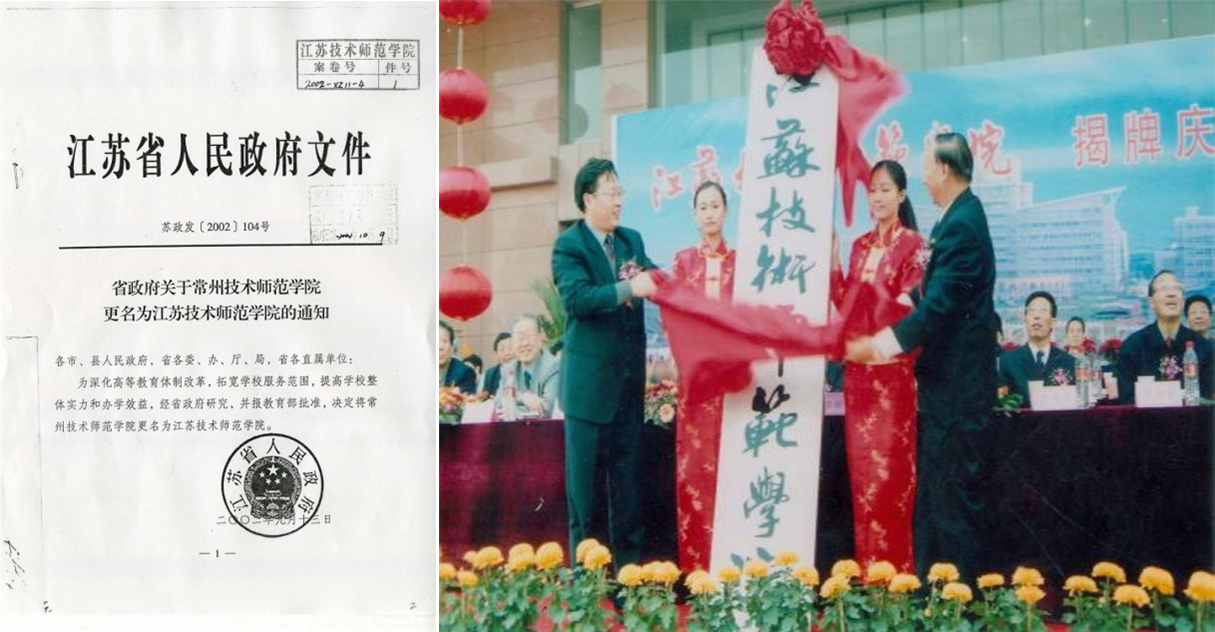 1.2002年,经教育部批准,学校正式更名为江苏技术师范学院。10月28日,学校举行江苏技术师范学院更名仪式,教育部高教司、师范司发来贺信;时任职教司副司长王继平、省委教育工委陈万年、市领导徐峻范、周亚瑜等出席揭牌仪式。
