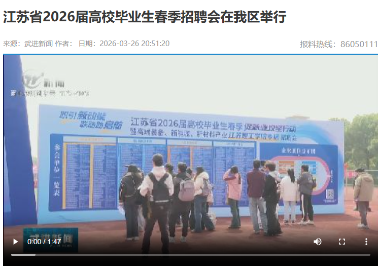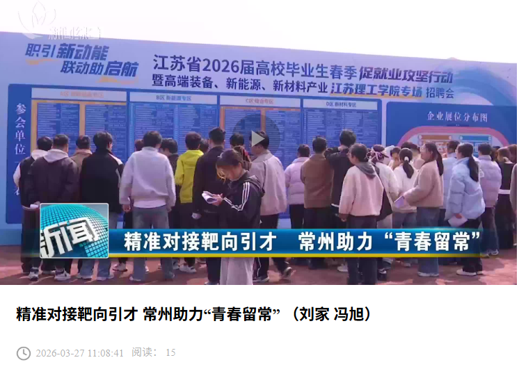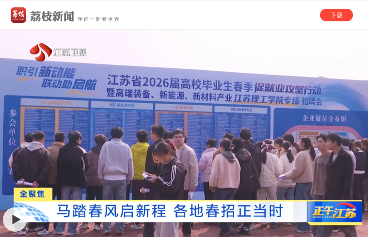 近日,江苏省2026届高校毕业生春季促就业攻坚行动暨高端装备、新能源、新材料产业江苏理工学院专场招聘会举行。招聘会紧扣江苏省“1650”现代化产业体系布局,聚焦常州“1028”产业发展规划,精准对接高端装备、新能源、新材料三大领域人才需求,集校地协同、企业集聚、服务精准于一体。