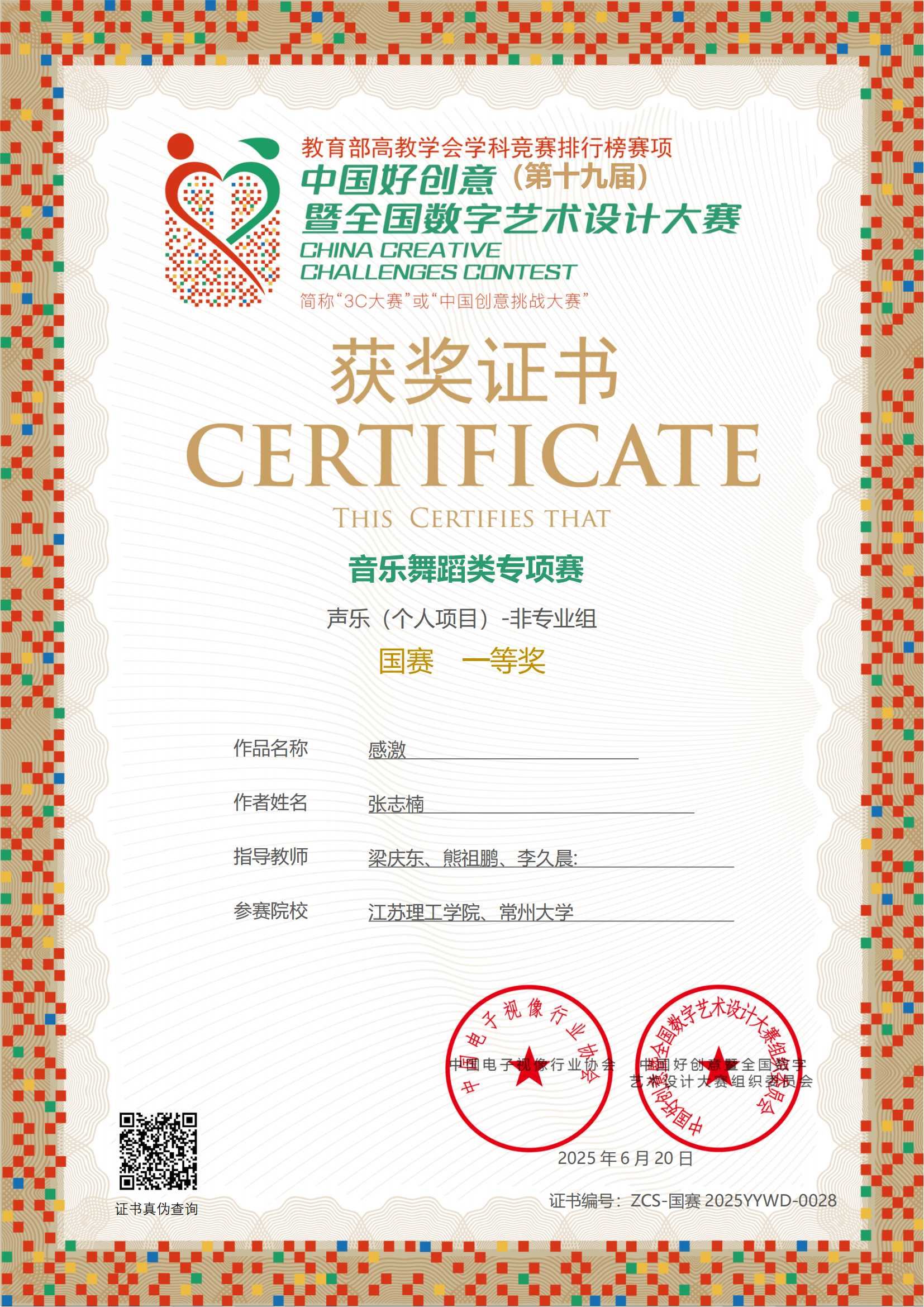 据悉,中国好创意(第十九届)暨全国数字艺术设计大赛(简称“3C大赛”),是入选教育部中国高等教育学会发布的《全国普通高校大学生竞赛分析报告》重要赛项,也是我国第一个以数字艺术、数字设计、数字创意、数字媒体以及数字技术创新领域各专业综合类规模大、跨学科、多专业、参与院校多、影响广泛的权威赛事。本届大赛以“传统与现代融合、艺术与科技共振”为主题,汇聚全国众多高校创意人才。来自全国各地高校的2435份音乐舞蹈类作品同台竞技,仅3%作品脱颖而出。(图文/创新创业学院、教育学院、艺术教育中心;审核/王田虎、杨新春;编辑/周雅倩)