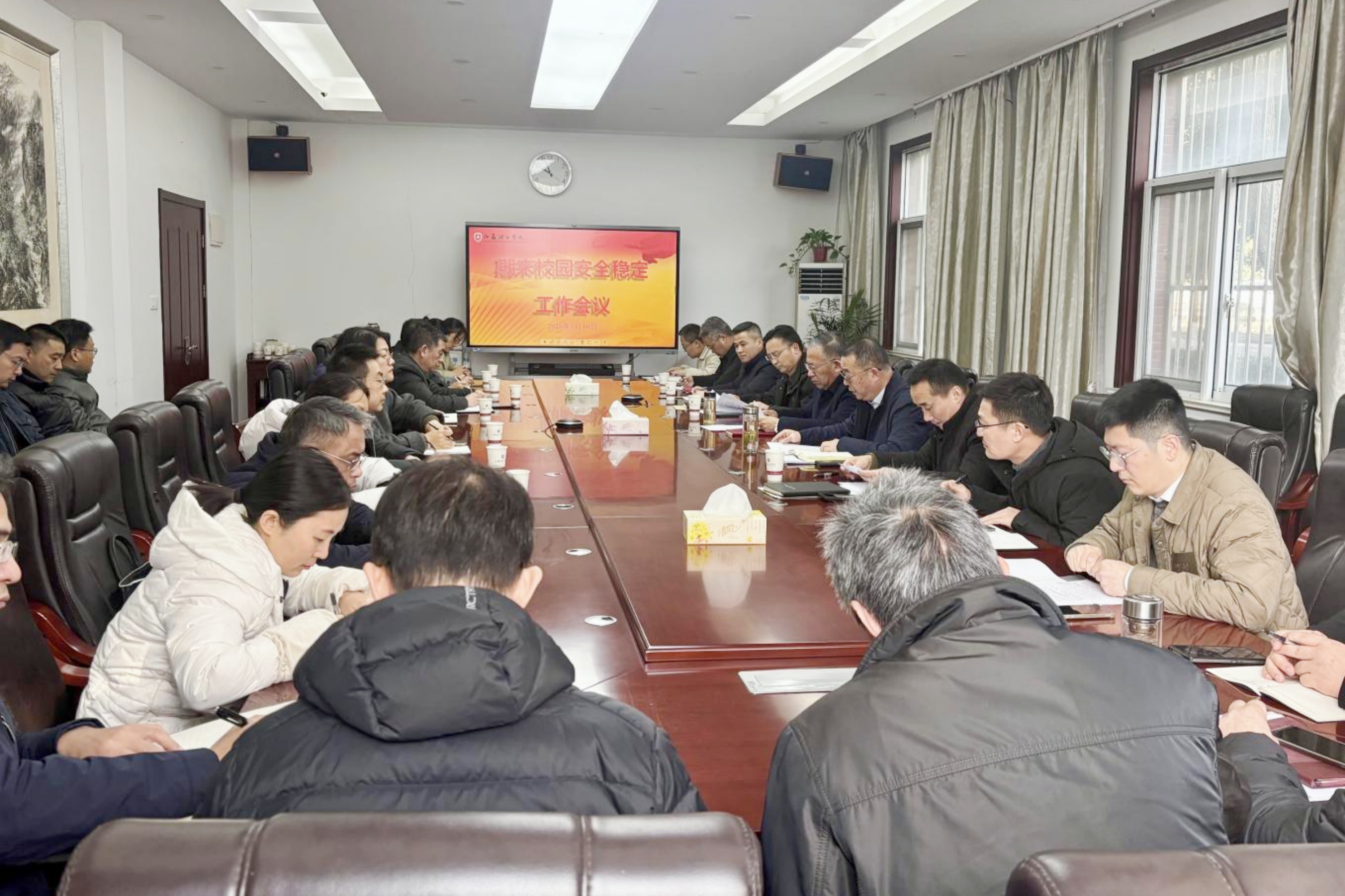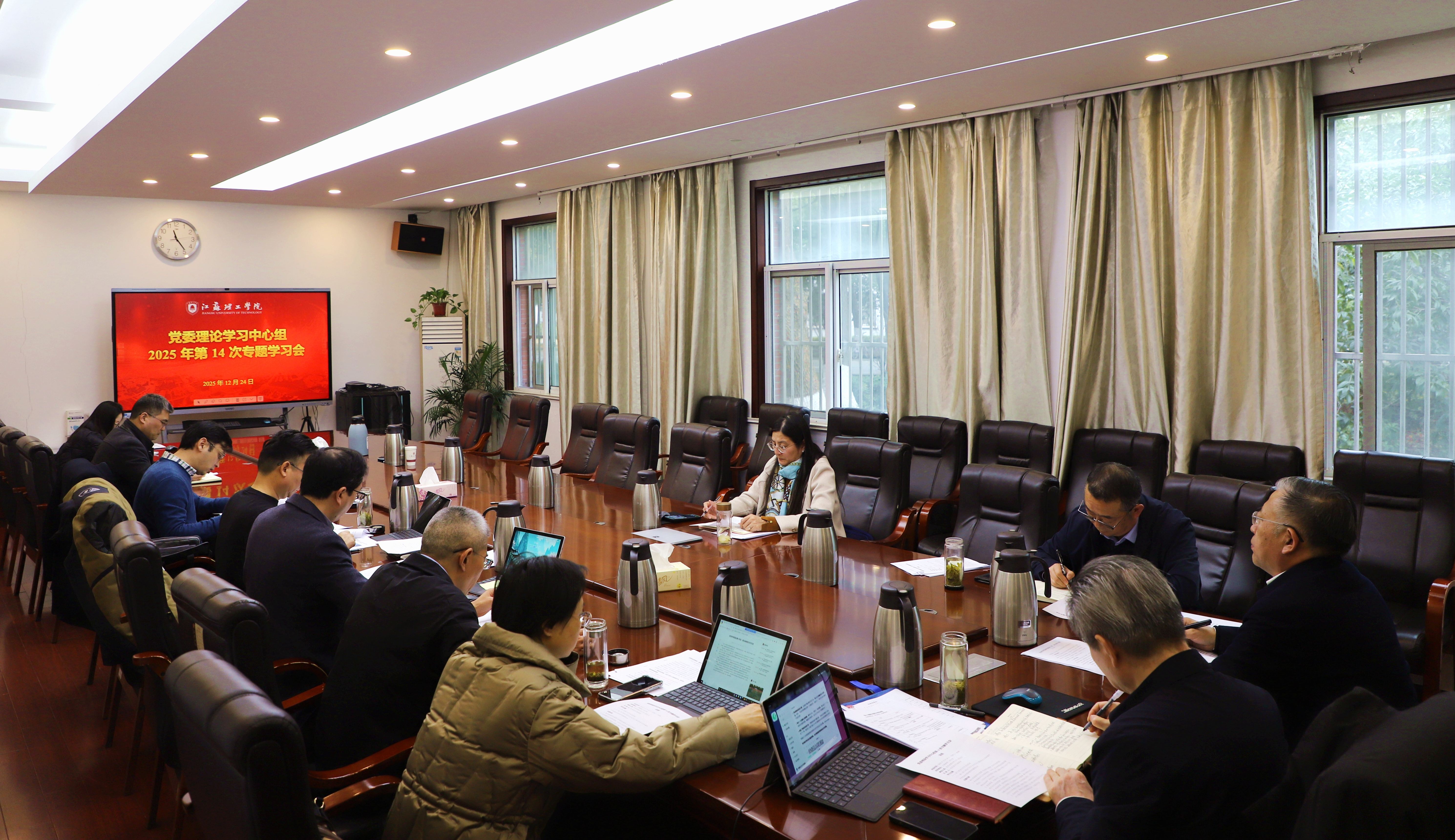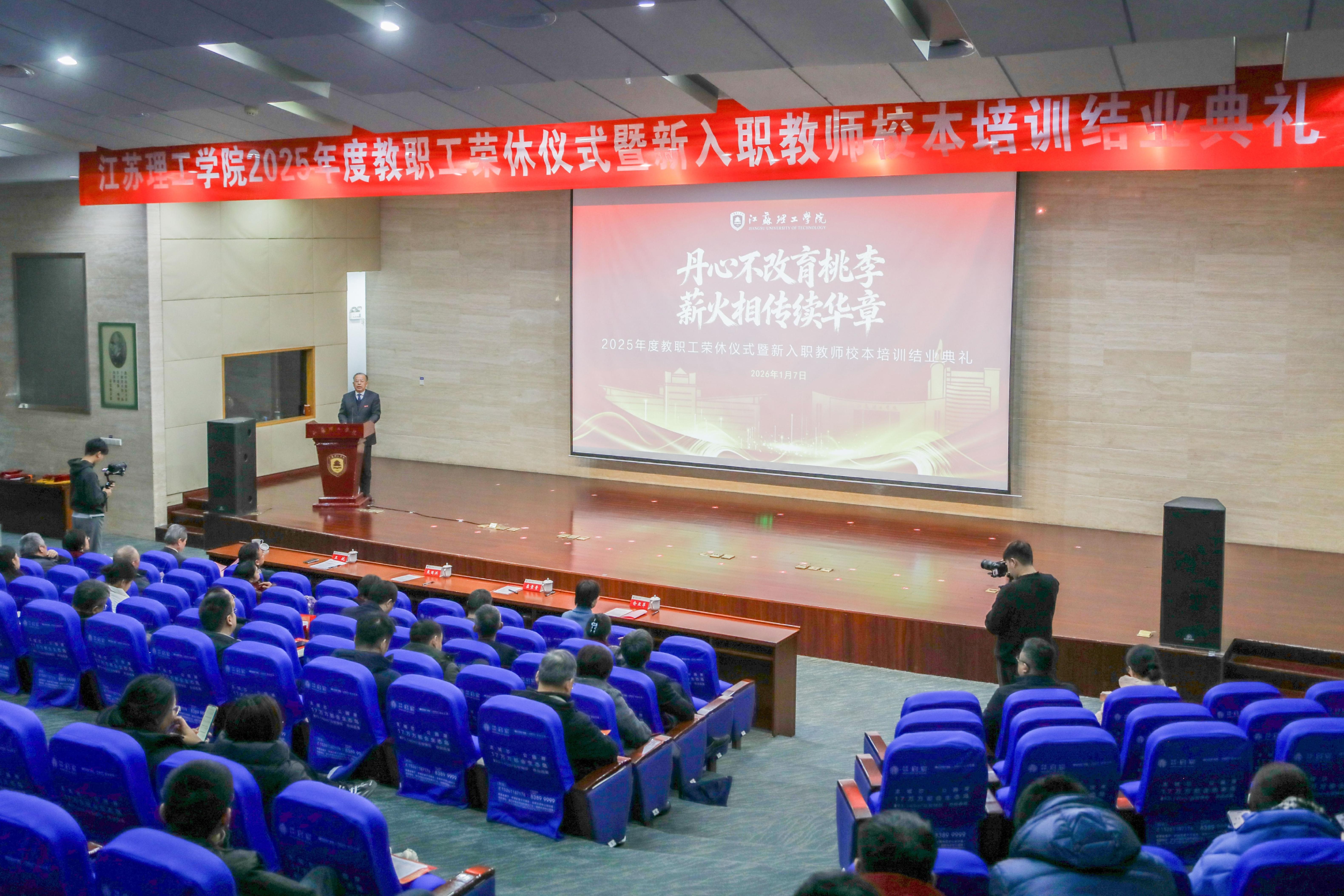 1月7日下午,我校在图书馆北报告厅隆重举行以“丹心不改育桃李 薪火相传续华章”为主题的2025年度教职工荣休仪式暨校本培训结业典礼。校党委书记崔景贵,校党委副书记、校长戴国洪,党委常委、副校长俞亚萍,党委常委、宣传部部长王斌以及党委办公室、党委组织部、党委教师工作部、教师发展中心、校工会、离退休工作处等职能部门负责人,各二级学院党组织书记,以及荣休教职工代表、新入职教职工代表、普通教职工代表齐聚一堂、共襄盛典。仪式由戴国洪主持。活动在荣休教职工风采视频展播中启幕。俞亚萍、王斌分别宣读2025年度荣休教职工名单、新入职教师教学能力大赛获奖名单与校本培训优秀学员名单。崔景贵、戴国洪为荣休教职工颁发纪念品、送上鲜花并一一合影留念。俞亚萍为新入职教师教学能力大赛获奖教师代表和校本培训优秀学员代表颁发荣誉证书。荣休教师代表、电气信息工程学院钱志文发表感言,她深情回顾了三十八载从教生涯,表达了对教育事业和学校的深厚眷恋。新老教师于海武、王锋、臧海娟、童伟携手演绎诗朗诵《师道长流,强国新篇》。荣休教师代表李卫华带领新教师代表共同宣读《新时代高校教师职业行为十项准则》。崔景贵讲话。他代表学校党委、行政